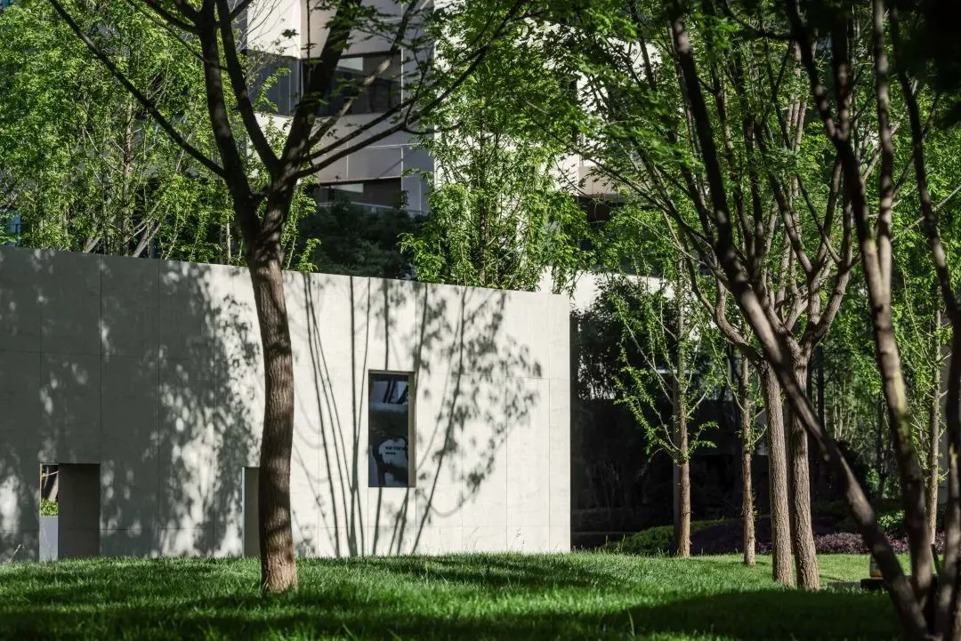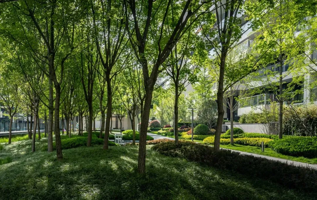 小區(qū)外是一片翠微林,四季青綠色的大葉女貞將小區(qū)和外面的馬路隔開,讓玫瑰園像一個(gè)被森林環(huán)抱的秘密花園,而花園里由銀杏、楓樹、紫薇樹、鵝掌楸、大葉女貞、松樹形成的六片主題純林,會(huì)隨著季節(jié)變化出不同的絢麗色彩。