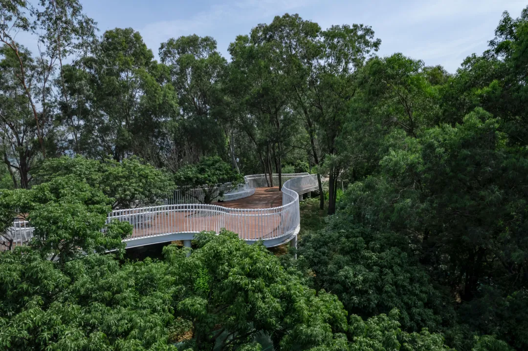 位于柴山半山腰的林梢棧道,像樹(shù)梢上的白色飄帶。站在觀景臺(tái)上,可以俯瞰科技館、遠(yuǎn)眺光明湖,視野觀景俱佳。設(shè)計(jì)采用部分雙層式觀景與360度環(huán)線平臺(tái)走廊,讓游人多角度欣賞光明中心區(qū)的風(fēng)景。